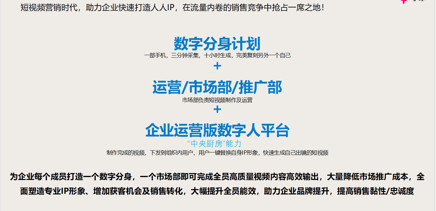 市場部用數字人制作一系列視頻,大量減少傳統制作視頻生產所需要投入的工作量及成本,且可以通過平臺一鍵下發到組織成員,每個成員都可以利用,生成N條不同IP出鏡的視頻,均攤的制作成本更低,裂變傳播效果更好。